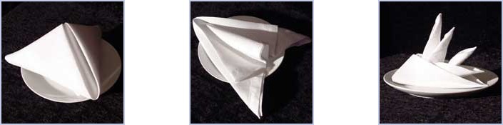 Now some folds that really stand up! The Bishop’s Hat, The Rosebud, and The Sail. Click an image: